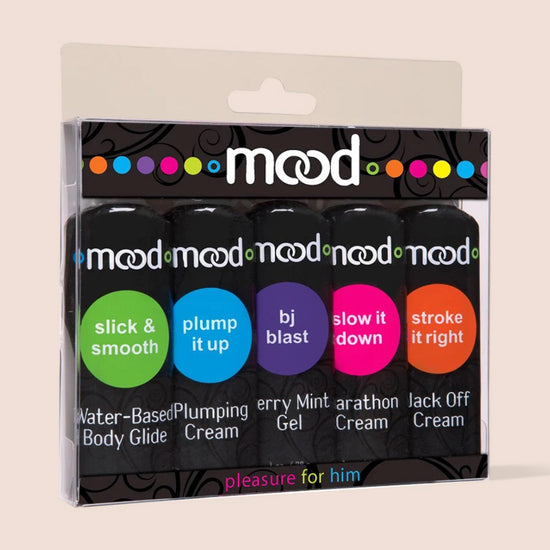The MOOD Pleasure for Him multi-pack features a non-sticky Slick & Smooth body glide, an ultra-plumping Plump It Up cream, delicious berry-mint flavored BJ Blast gel, a Slow It Down marathon cream for better stamina, and the fan-favorite Stroke It Right jack off cream.