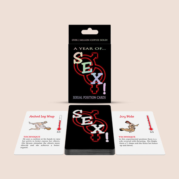 A Year of SEX! offers you over 50 different Kama Sutra positions. Use the cards as positional references or play one of the three SEX! games to build your fantasy. Each A Year of SEX! card offers a sex position illustration, technique instructions, and a challenge rating of 1-5, with 5 being the most intensely orgasmic. Includes new artwork to the packaging AND sex position cards.