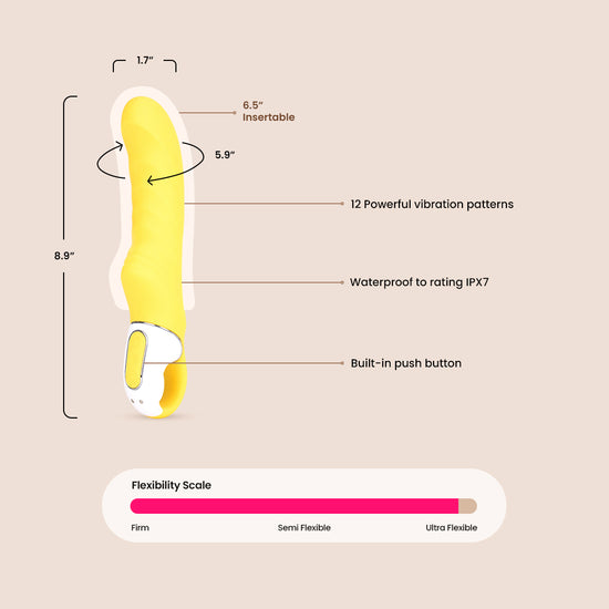 Satisfyer Yummy Sunshine G-Spot Vibrator is a pleasurably curved vibe that pampers you with its sensually ribbed structure, inclined tip, and deep vibrations. In a perky yellow with a smooth touch surface, it will give you intense climaxes, making your sunshine for days!