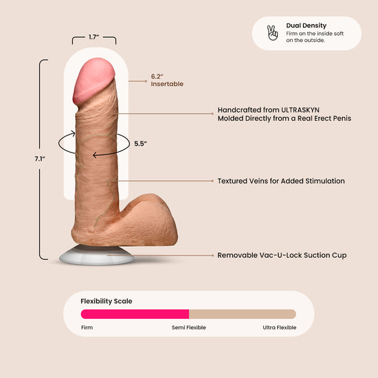 Don't be fooled by imitations! Made of dual-density ULTRASKYN™, this Realistic® C_ck is soft on the outside, and perfectly hard on the inside, making it the most realistic c_ck ever made! This Vac-U-Lock compatible Realistic® C_ck features hand crafted detailing and a removable suction cup base for a smooth ride. Phthalate-free and body-safe.
