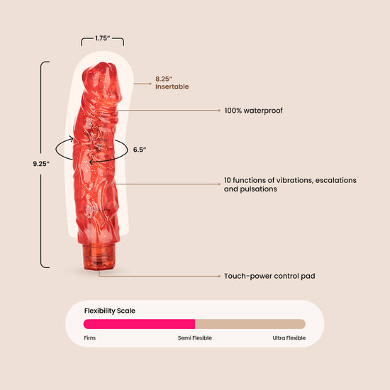 This waterproof, incredibly soft 10-function vibrator has a large penis head, thick veins, and eye-catching glitter inside its jelly frame.