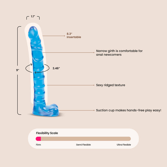 Despite its impressive 8 inch insertable length, this toy's slim shaft and tapered head make it a great introduction to anal pleasure. Jelly rubber is flexible enough to bend with you while you squirm and fit to your body.