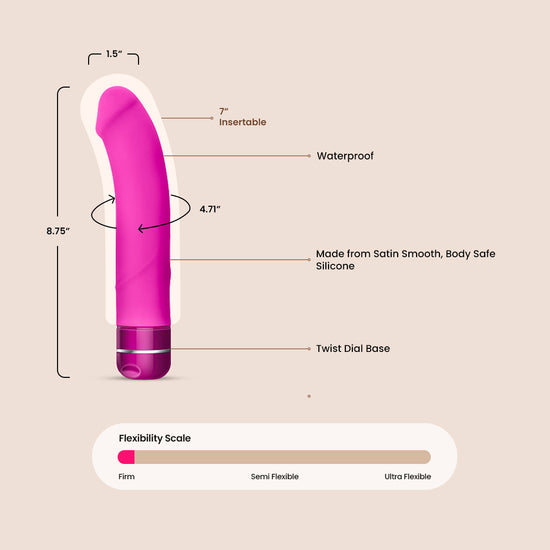 Artfully designed with a smooth flowing profile which is not only beautiful but also incredible for intense orgasms Mind blowing deep rumbly vibrations conveniently controlled with a twist of the dial controller located at the base Semi soft satin coated silicone for a sensual and realistic feel Made from pure body safe silicone and meets or exceeds international safety standards as set forth by CE and RoHS directives. Phthalate and latex free. It's your body be mindful of what you put in it.