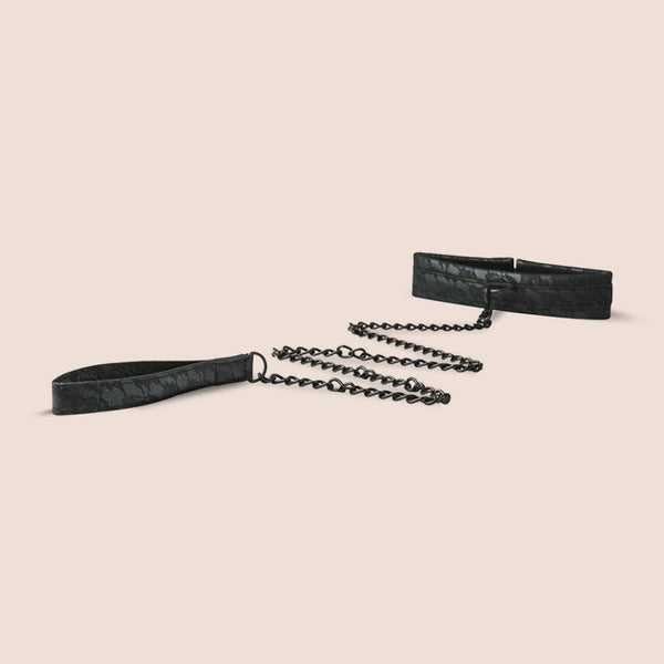 The comfortable padded collar, made of soft, inviting fabric of fine lace, fits perfectly around most any size neck. Linked leash serves as a constant reminder of who is running your fantasy.