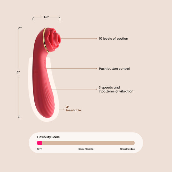 Get your orgasm on with these passion petals! They'll gently s_ck on your clit with their air-stim technology, giving you 10 different levels of suction that'll increase blood flow, sensitivity, and pleasure. But wait, there's more! The shaft of the toy has gentle ridges that'll give you a sensational massage as you switch between 3 speeds and 7 vibration patterns. Made of premium silicone and phthalate-free, this toy is body safe and waterproof, so you can use it in the shower or get nice and wet. When you're done, just charge it up with the USB cable and get ready for round two. Don't forget the water-based lube! Start with the vibrating shaft, then switch to the passion petal rosebud and massage it over your clit until it captures it in its sucking petals. Pull it away and press it back on again, then repeat until you edge yourself to full release. When you're done, just wash it with warm water and soap, then spray it with a toy cleaner and store it in a cool, dark place.