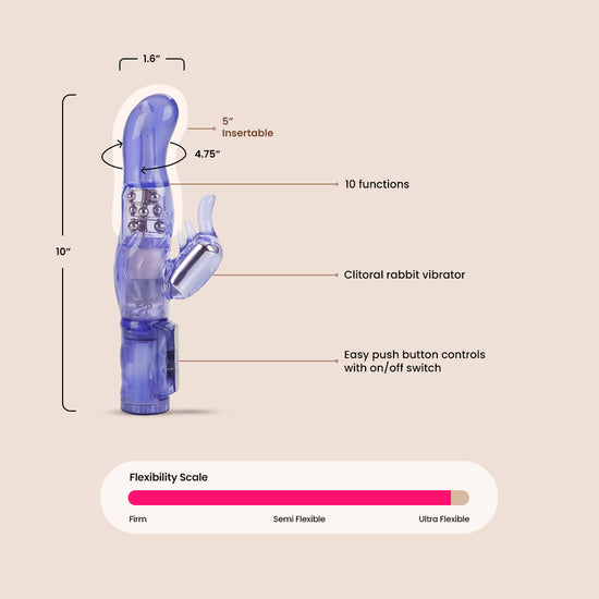 A contoured, flexible, yet firm shaft finds the right spot effortlessly, while rows of pleasure beads spin around inside to add tons of sensation.