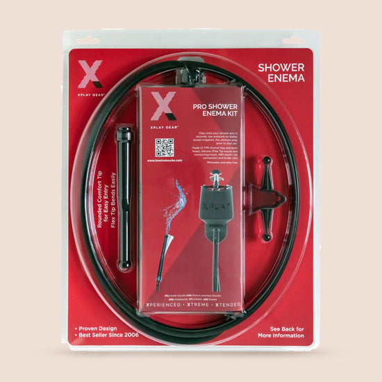 The XPLAY® PRO Shower douche is a next generation shower and travel anal douche which you can set up and remove in seconds. It was engineered (and tested!) to perform like no other douche. By converting high pressure to a comfortable flow, XPLAY® PRO Shower douche cleans expediently and efficiently. The system which snaps on to any standard shower hose pipe with the shower clip, includes a light weight funnel bag, a 6" TPR douche hose, and a 5" TPR drain hose. The system also comes with an 8" silicone flex-tip nozzle, which allows the user to reach broadly, with assurance, and a premium 5" ABS plastic tip. The system folds to compact size. The XPLAY® PRO SHOWER DOUCHE is the ultimate prep system for anal sex.