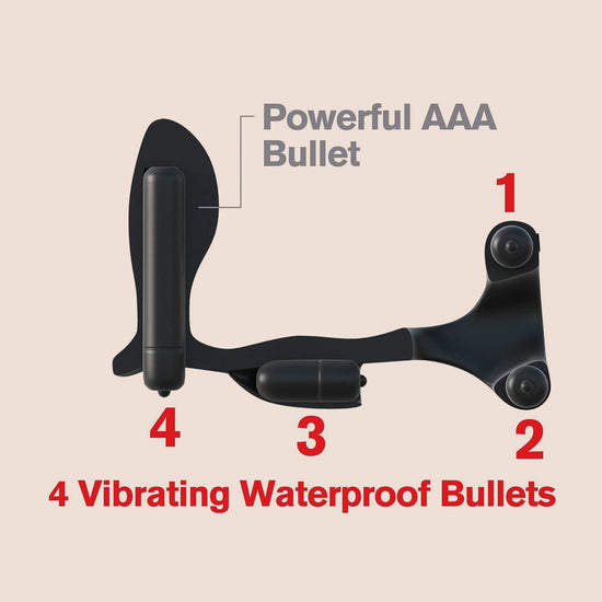 Made from silky-smooth, phthalate-free, latex-free Elite Silicone, this quadruple-action cock ring doubles as a wearable P-Spot plug, allowing you to prolong ejaculation and extend the session while enjoying an incredible prostate and taint massage. The strategic placement of its four vibrating bullets is what makes this toy so sensational. One bullet sits on the top ring for direct clitoral stimulation, one sits in front of the balls for an incredible buzz, one sits inside the ribbed perineum stimulator for a tantalizing taint massage, and one sits inside the prostate plug for wall-banging, backdoor bliss. With all four bullets buzzing away, sex will never be the same again!