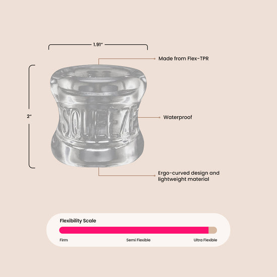 Made with the signature Flex-TPR, Squeeze is lightweight and compact but packs a punch unlike any other. Unlike silicone, Flex-TPR has a completely different feel for a new stretching sensation. Squeeze's ergo curved design and light weight material make it a must-have for your ball stretching routine. Wear it during s_x for some serious sweaty ball slapping or keep it on during your daily routine for a fun swinging sensation while running errands or kicking back on the couch. Safe, non-toxic and phthalate-free, and lube safe with water-based lubricants. Add some swing to your sack with Squeeze!