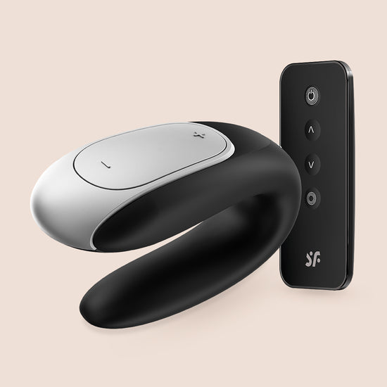 The Satisfyer Double Fun will enrich your love life with powerful vibrations that stimulate both of you sensually. The classic U-shape couples vibrator is worn during lovemaking and stimulates the entire penis as well as the G-spot with its insertable shaft. The second motor is hidden at the other end of the couples vibrator and stimulates the clitoris at the same time. The couples vibrator is made of body-friendly silicone, which feels especially soft on the skin. Your fun together can also continue in the shower or bathtub: Thanks to its waterproof (IPX7) finish, the Satisfyer Double Fun is the ideal companion for wet and wild pleasure. If your device ever runs out of steam, you can recharge the integrated batteries with the included USB charging cable.