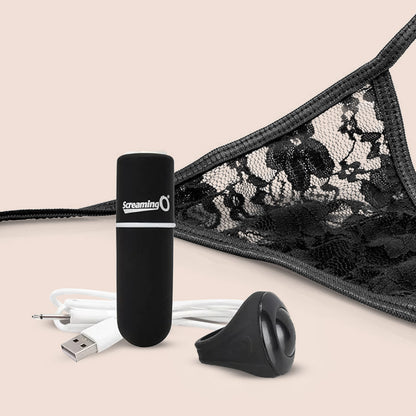 Play in public with the My Secret rechargeable remote vibrating panty, which comes with a waterproof 10-function rechargeable Vooom® bullet that fits discreetly into the side-tie lace underwear. The My Secret panty from Screaming O features a secret pocket that keeps deep, rumbling vibration right where you want it and fits up to 60-inch waists for a comfortable feel. The discreet push-button remote ring works up to 50 feet away and is made of soft-and-stretchy True Silicone® for easy wear on almost any size finger. The bullet vibrator, which works with or without the ring, lasts for more than 60 minutes on a single charge and is supported by a 2-year limited warranty. Whether for a tickling tease or some sex-life spice, the My Secret panty inspires connection with a splash of mischief and takes lacey lingerie to a new level.