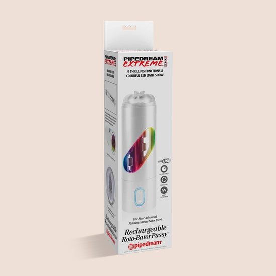 Get ready for the most incredible, most intense, most advanced rotating masturbator ever imagined! The Rechargeable Roto-Bator is the ultimate turbo powered masturbator that does all of the work for you! No more pumping, stroking, or squeezing - just push a button and enjoy mind-blowing stimulation developed to make you cum harder than ever before! Unlike ordinary strokers that barely move up and down, the Roto-Bator's advanced rotation mechanism puts a whole new spin on male masturbation! Powered by an ultra strong motor, this full automated masturbator features nine thrilling rotation patterns to choose from. Each pattern has a colorful LED light display that changes color with each movement.
