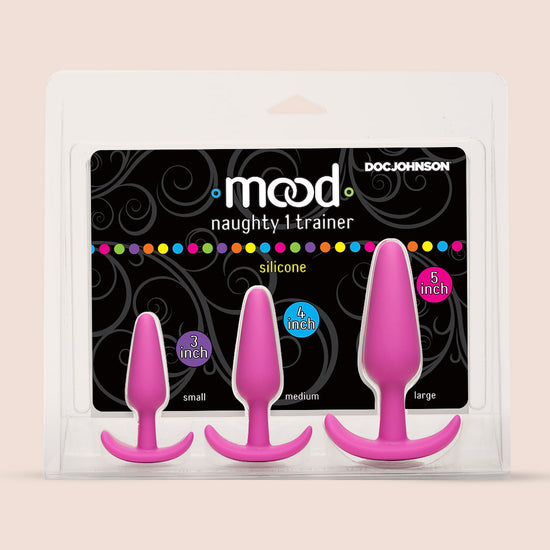 How naughty do you want it? The Mood Naughty 1 Trainer Set in premium silicone includes our bestselling original Mood Naughty butt plug in three graduated sizes. Measuring at 3, 4, and 5 inches, this set is perfectly shaped and sized to help backdoor beginners gently expand the boundaries of their anal experience. The classic tapered tip of Mood Naughty slides right in, and the firm yet flexible material and curved rocker base make these plugs comfortable and safe for extended wear.