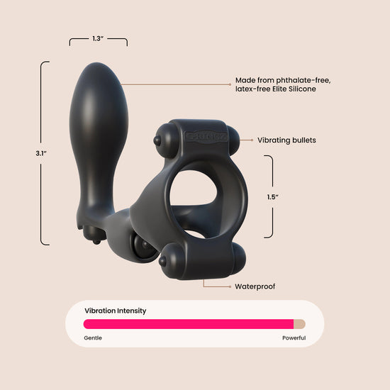 Made from silky-smooth, phthalate-free, latex-free Elite Silicone, this quadruple-action cock ring doubles as a wearable P-Spot plug, allowing you to prolong ejaculation and extend the session while enjoying an incredible prostate and taint massage. The strategic placement of its four vibrating bullets is what makes this toy so sensational. One bullet sits on the top ring for direct clitoral stimulation, one sits in front of the balls for an incredible buzz, one sits inside the ribbed perineum stimulator for a tantalizing taint massage, and one sits inside the prostate plug for wall-banging, backdoor bliss. With all four bullets buzzing away, sex will never be the same again!