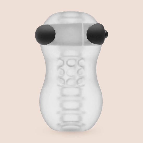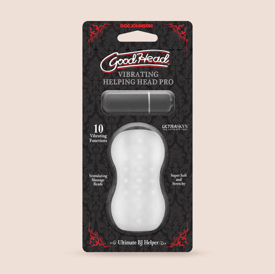 Doc Johnson's new GoodHead Vibrating Helping Head Pro is a 3-inch mini stroker and bullet vibe specifically designed for handheld use to heighten the sensations and pleasure during fellatio. Soft on the outside, and with stimulating massage beads on the inside, this uniquely-shaped stretchy stroker is made from our clear ultra-realistic ULTRASKYN, and the vibrator fits right in to provide a more intense sensation. Turn GoodHead into great head tonight!
