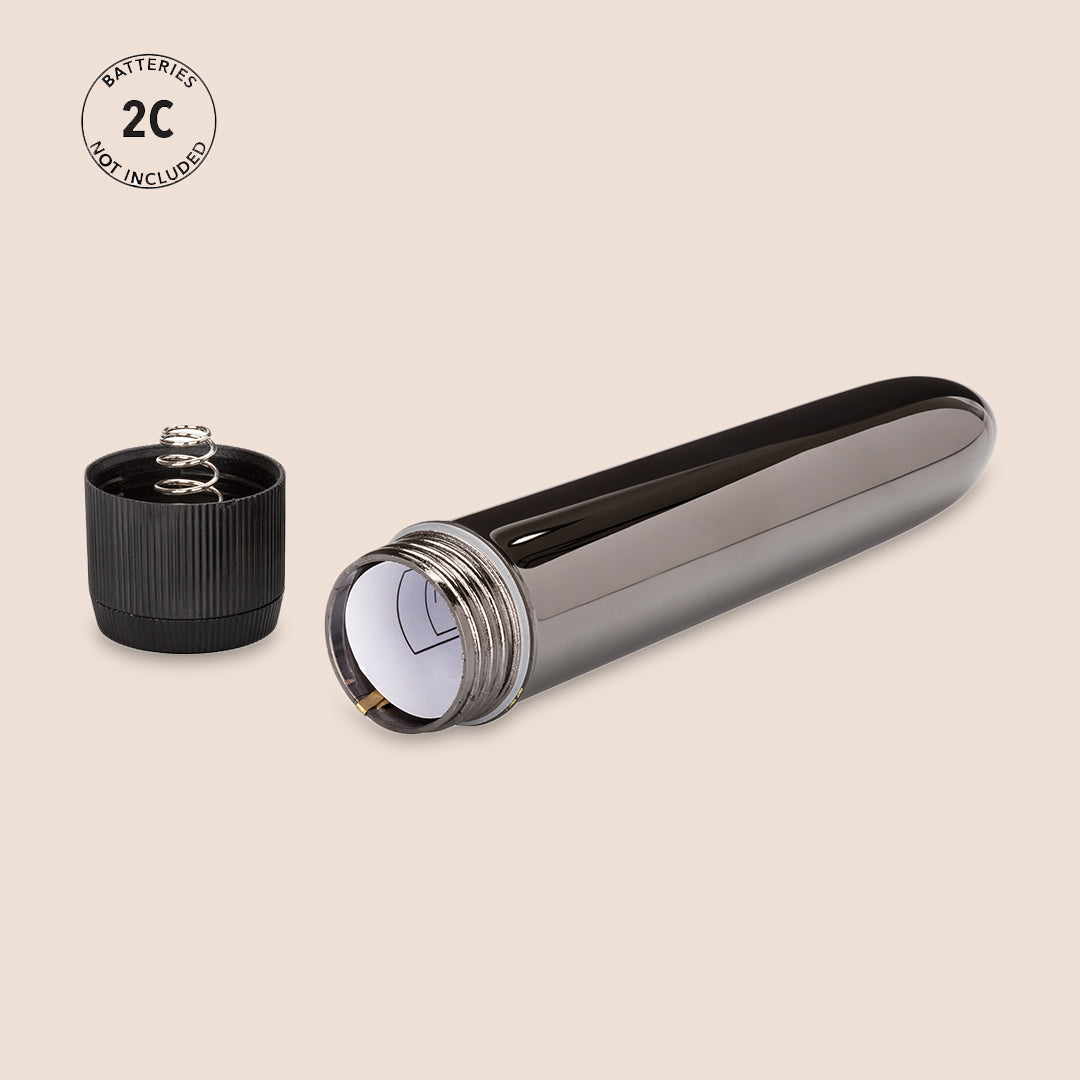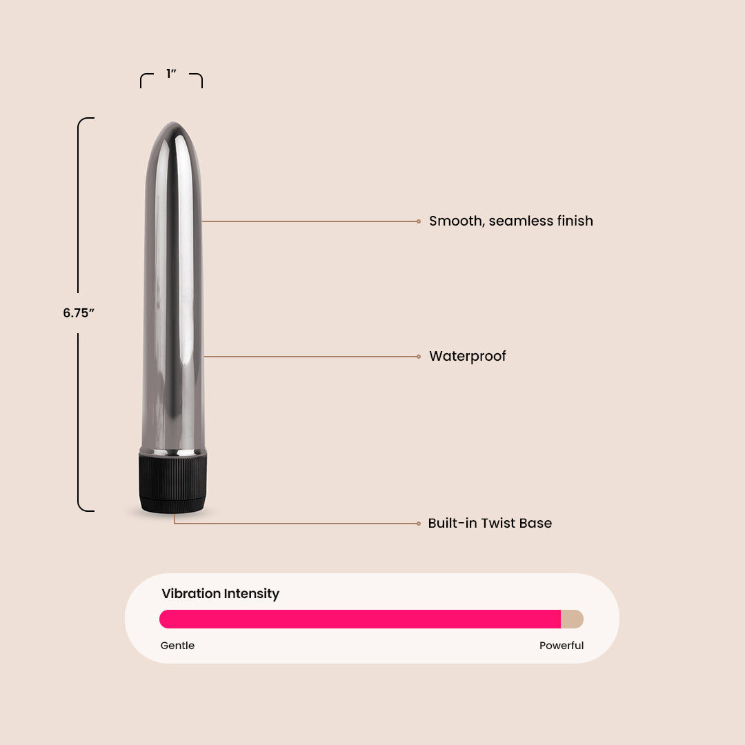 Smooth, seamless and perfectly weighty, a traditional tapered shape inserts easily and smoothly, offering lots of room for deep penetration, plus the soft point at the tip directly pinpoints individual sweet spots. Powerful multiple speeds are centered at the head, providing lots of intensity where you want it most; the vibrations are carried very well throughout the firm, unyielding plastic for evenly distributed sensation. Since the Metal is made from nonporous, slick plastic, it's very hygienic and easy to clean, a good rise with soap and water will do the trick, plus, you'll be able to safely use your choice of lube. Takes two C batteries, which are sold separately. Waterproof.