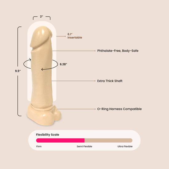 With a very satisfying 9 inches of insertable length, a girth of 6 1/2 inches around and a soft, pliable but gently firm jelly rubber material that's designed to look and feel like the real thing, it's sure to please you many times over.
