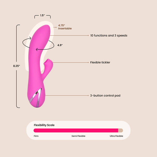 While the flickering vibrations work their magic, the full-coverage suction tip gives you knee-shaking suction stimulation. The stimulating encaser has 10 functions of suction for wave after wave of orgasmic external stimulation. The shivering shaft of this ravishing rabbit uses an intense vibration motor for deeply satisfying internal stimulation. The flexible tickler vibrations can be used independently from the suction functions for truly customizable pleasure.