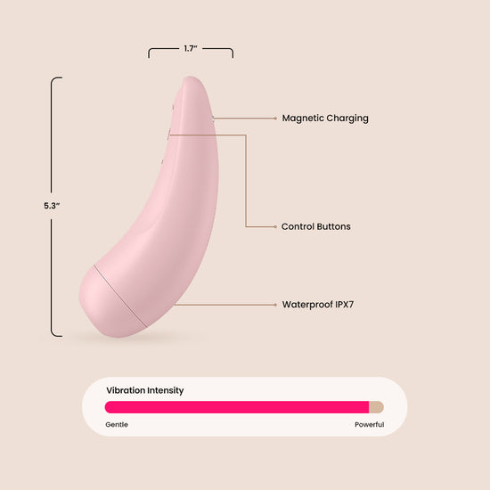The Satisfyer Curvy 2+ is a pressure wave vibrator that gently surrounds your clitoris with its soft silicone head and catapults you to breathtaking climaxes with no-contact pressure wave stimulation and luscious vibrations. Choose between the exciting intensity levels of the pressure waves and combine them with the vibration programs – it’s so easy to let this pleasure-giver flood you with waves of excitement.