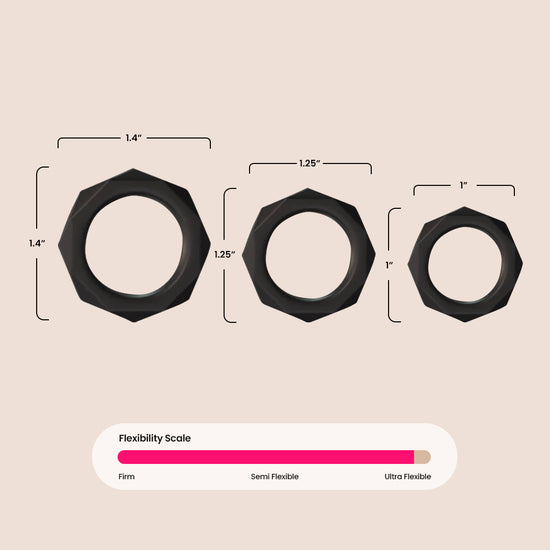 Made from our phthalate-free, body-safe Elite Silicone®, the three performance rings range from 1 (2.5 cm) to 1.375 (3.5 cm). Find the perfect size for you and put it around the base of your shaft to gently restrict blood flow and help you achieve the biggest and most intense erections ever imagined! Try the rings in different combinations to find the most explosive results! Use all three rings at the same time for the ultimate stamina test!