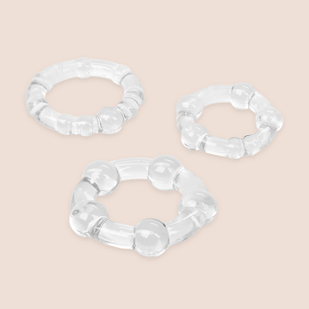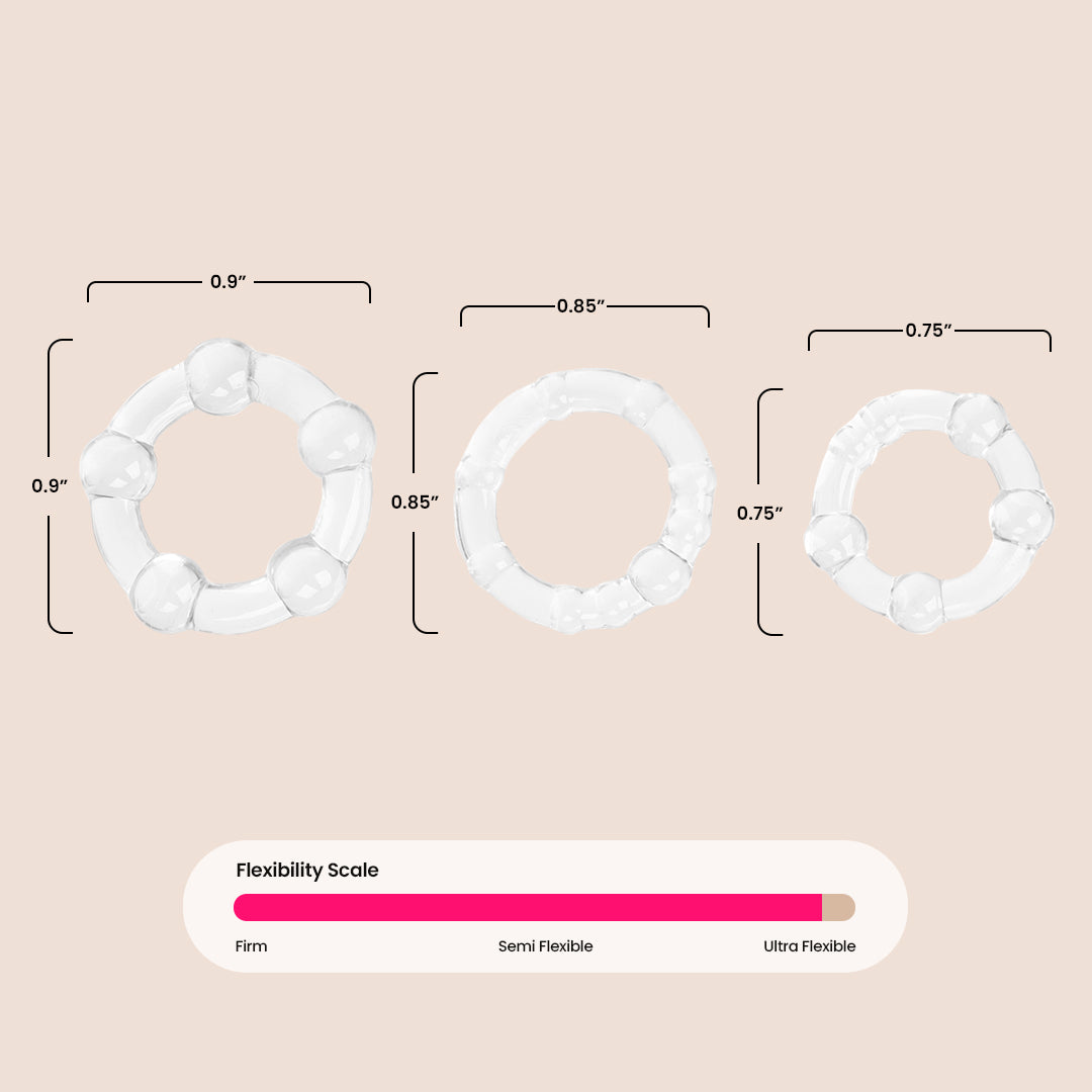 The rings are made from soft, smooth and flexible, transparent TPR and are adorned with sensuous pleasure beads and stimulation Nodules, for enhanced orgasmic sensitivity. The exotic erection enhancers are designed to support stamina for prolonged performance. To use, choose your ring and slide it on to the erect penis so that it provides a secure fit at the base. Use a quality lube for increased sensations and unlimited enjoyment.