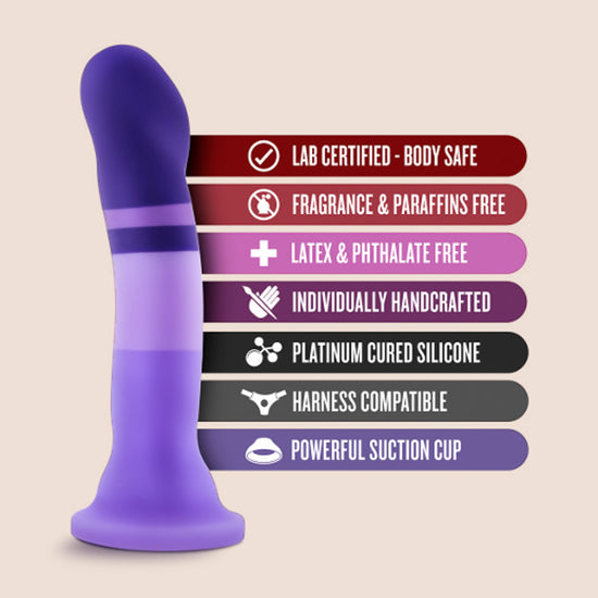 Modern, stylish, and beautiful—meet Avant. The Avant D2 Purple Rain dildo is hand-sculpted from body safe, platinum-cured silicone for a natural shape and feel. The silicone finish on this toy is silky smooth and makes it extremely comfortable to use. It's non-porous for an easier, safer cleaning experience. The mixture of deep and light purples in the D2's pattern gives off an aura of luxury that makes your bedroom play feel indulgent, heightening your pleasure and edging you to a climax that feels fit for royalty.