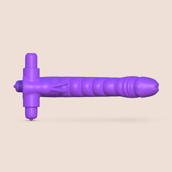 Double the pleasure and double the fun with the incredible Silicone Double Penetrator Rabbit! Now you both can enjoy the thrill of double penetration without having to worry about introducing a third partner into the mix! Made from our body-safe, phthalate-free Elite Silicone, this dual-bullet double penetrator features a ribbed silicone dildo perfect for exploring your D.P. fantasies. The stretchy silicone c ring puts a clamp on performance letdowns by delivering a tight squeeze to his shaft, while two powerful bullets provide thrilling vibrations you both will enjoy! One bullet sits on top of the ring and slides into the rabbit clitoral stimulator and the other slides inside the base of the silicone dildo for vibrating anal stimulation.