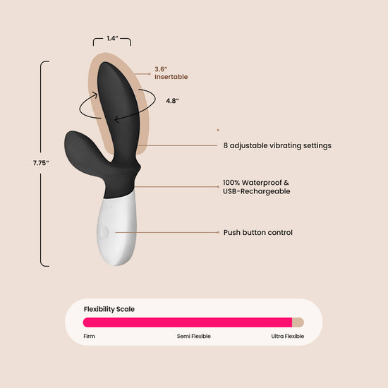 This incredible vibrator features 10 pleasure settings, from ticklish to extremely powerful. The vibrations are intense and deeply satisfying. The Loki Wave has a motor on each tip - one for anal insert and the other for perineum stimulation.