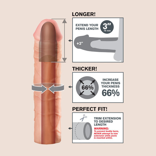 The Mega 3" Extension is a customizable extension that can be easily trimmed at the base for a perfect fit. It's super-stretchy to accommodate most sizes and snug enough to help you last longer. Your partner will enjoy deeper penetration with the 3" extension at the tip, while the ultra-lifelike shaft makes you 66% thicker all around. The soft Fanta Flesh material feels just like a second skin, giving you the length, girth, and confidence you need to satisfy your lover.